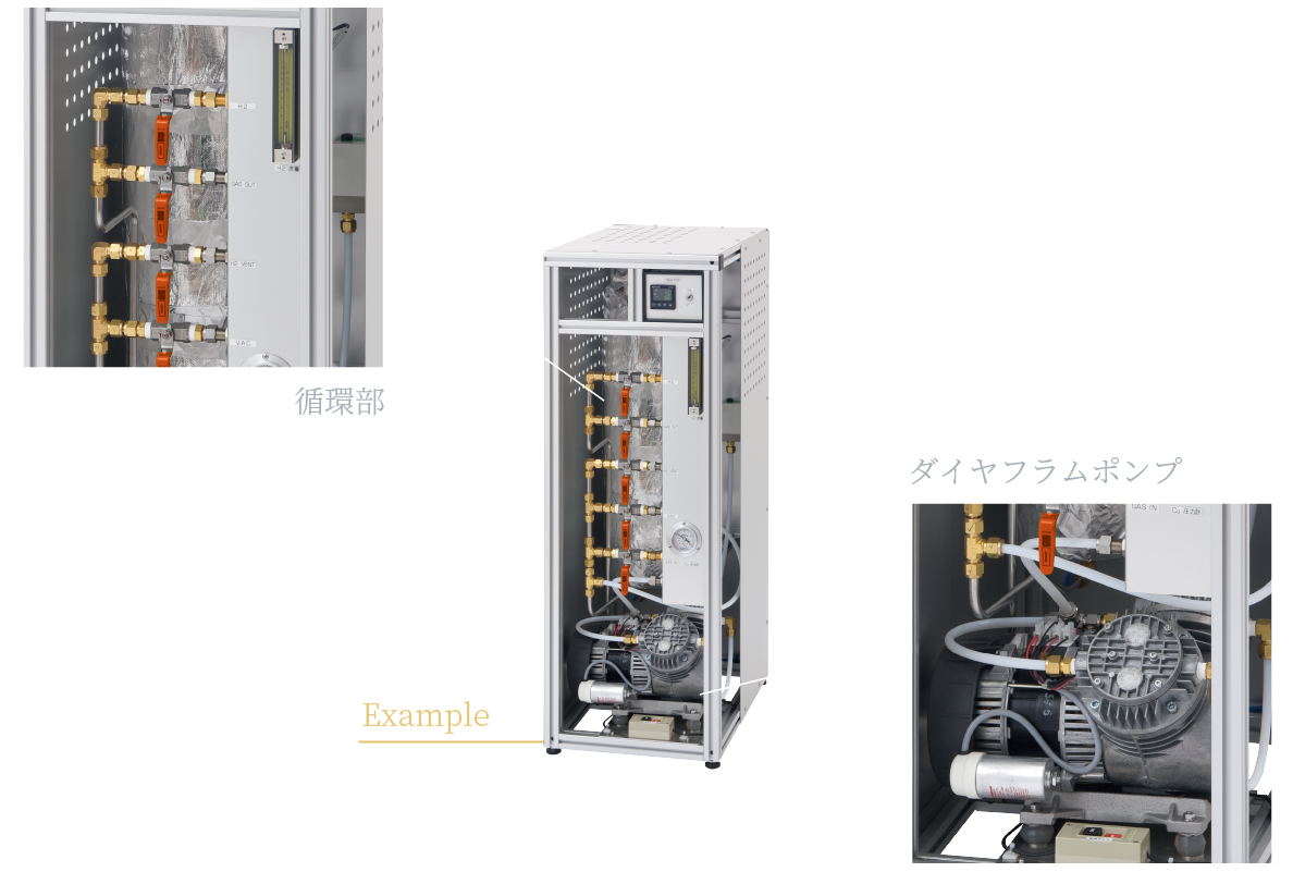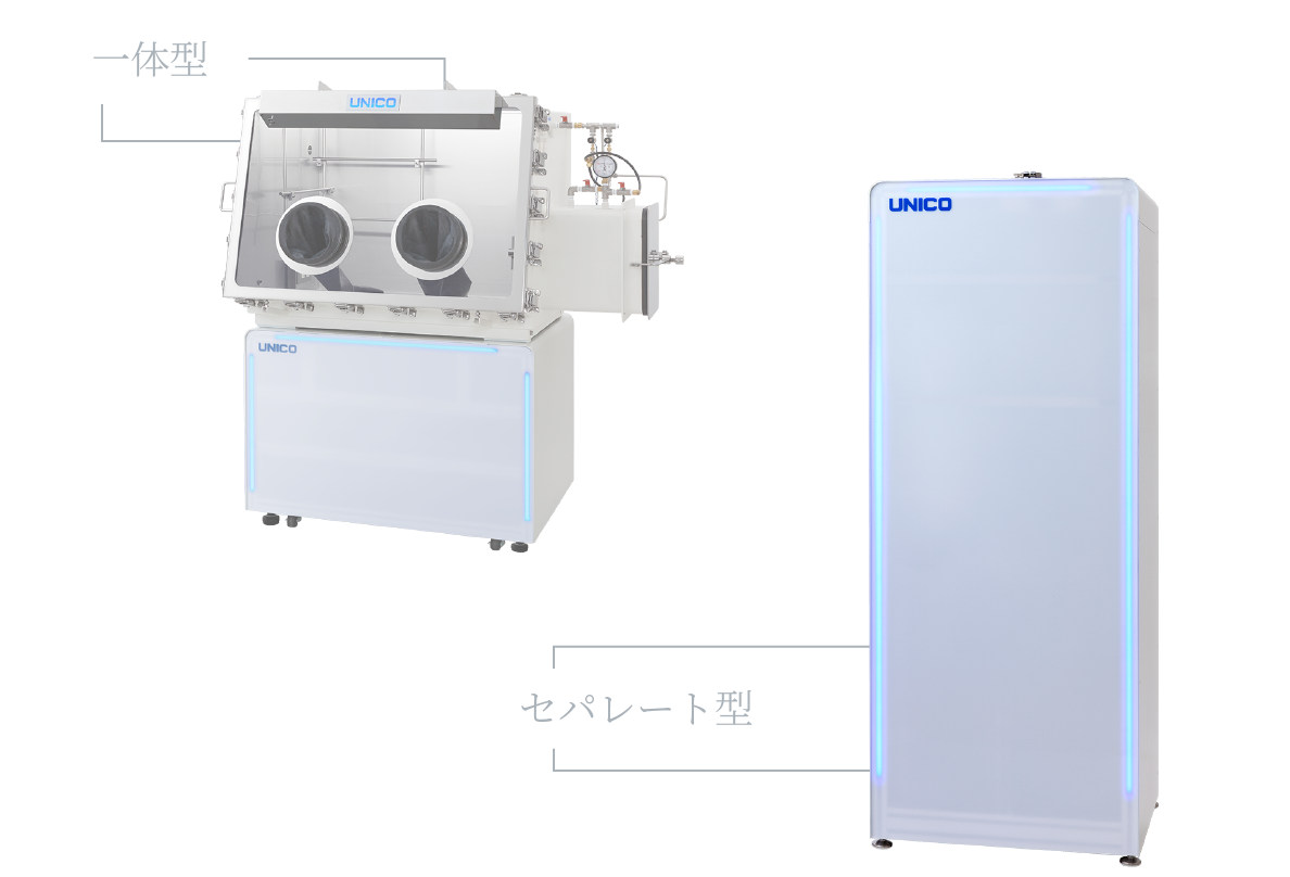 ガス循環精製装置本体はグローブボックスと別置きですので、後付けや付替えも自由にお選びいただけます。