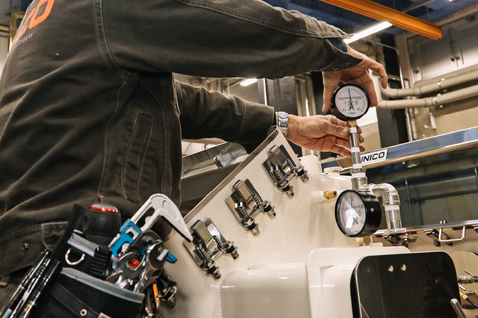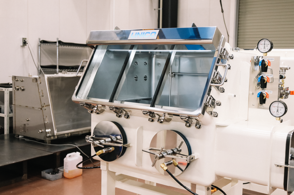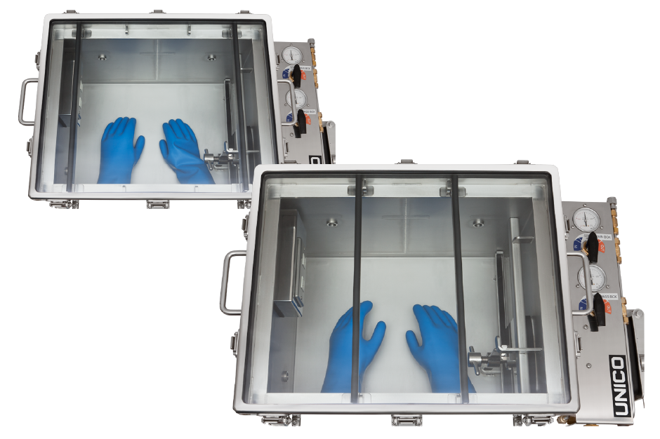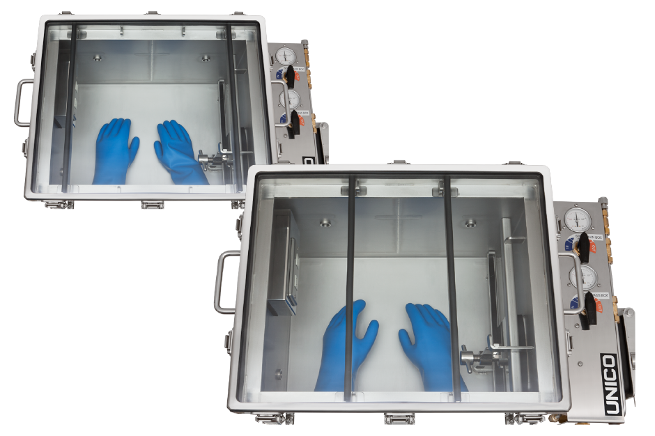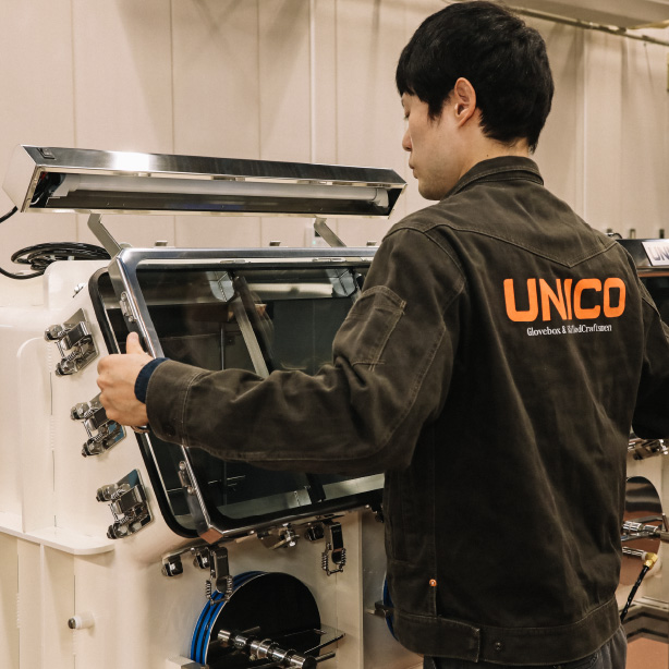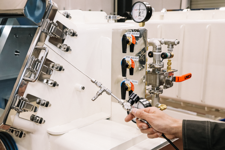 最も基本的に重要な気密性についてUNICOは全てのグローブボックスに対して、半導体装置の検査などに使用される高性能ヘリウムガス・ディテクターとスニファー検査機により実際にグローブボックスが使用される微圧条件下において実践的な厳しいリークテストをダブルチェック体制で行なっておりますので安心してご使用いただけます。