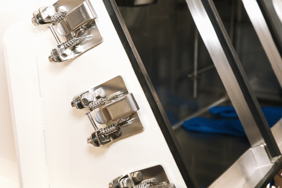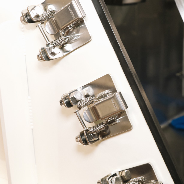 大搬入口となる正面強化ガラス窓の開閉によるリークを防ぐ完全密閉機構です。