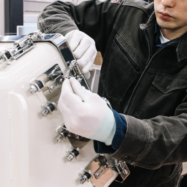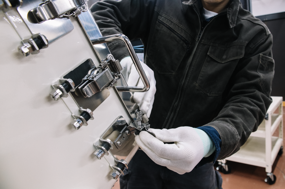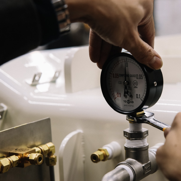様々なパーツを取付けける組立・調整の工程です。 リーク検査と接続作業を繰り返しながら妥協せず組み上げていきます。
