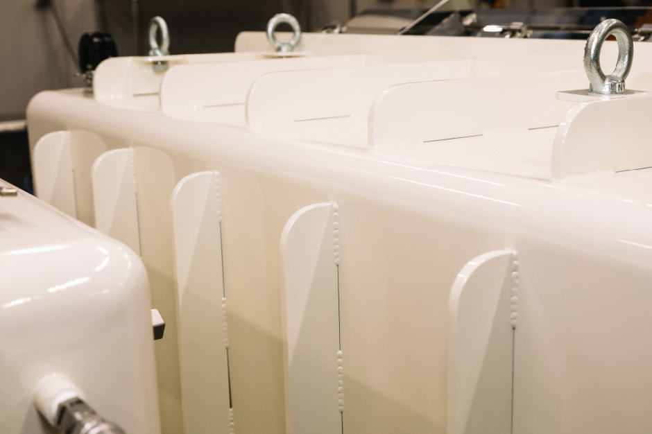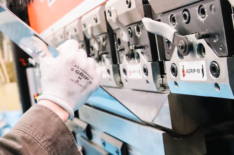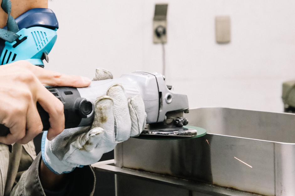 グローブボックスの胴体に側面板・グローブポート等を溶接します。 次に、UNICO 製グローブボックスの特徴である各コーナー部分の滑らかな“R”(丸み)を熟練した製造部員による高度な板金溶接加工技術を駆使し、美しく使いやすいグローブボックスの形へと手際よく整えていきます。